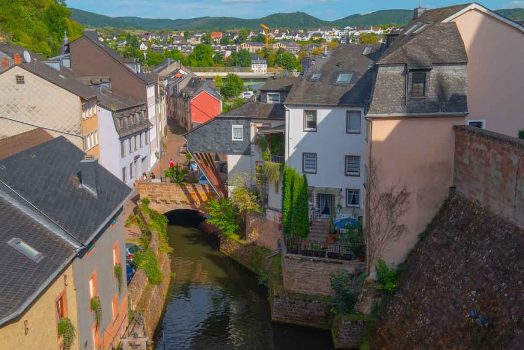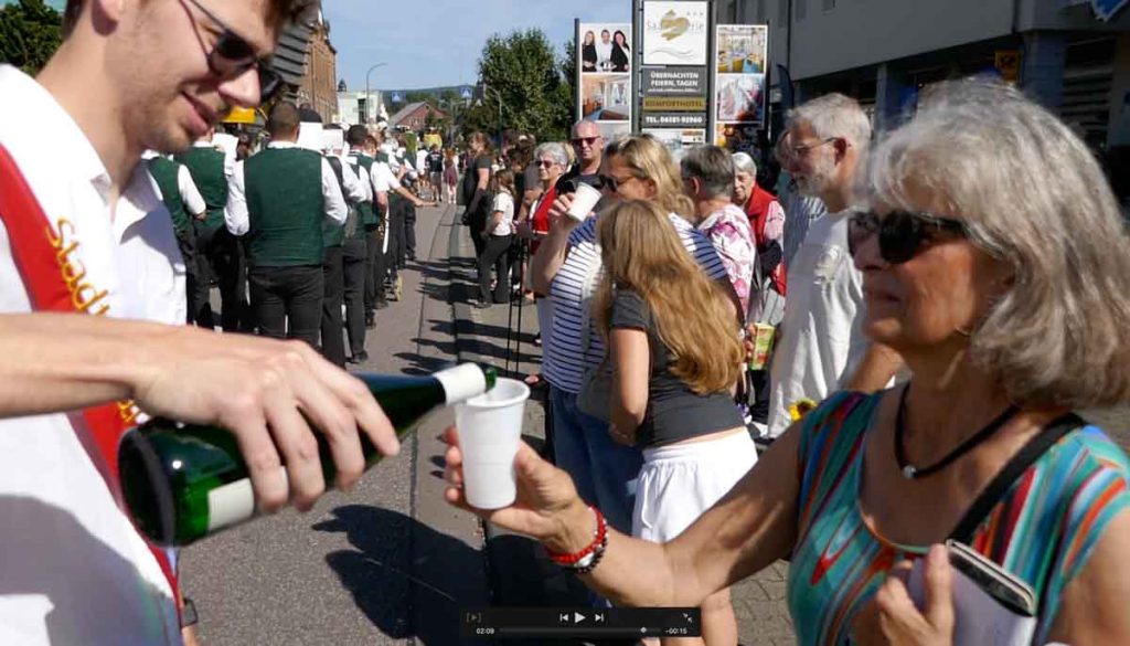 Vandaag was het feest in Saarburg. Een grote optocht waarvoor het hele dorp was uitgelopen. De plaatselijke bevolking langs de route hadden allemaal een wijnglas bij. Nagenoeg alle lopers in de optocht hadden flessen gekoelde witte wijn die werd geschonken aan de toeschouwers. Wij hadden natuurlijk geen glas bij maar kregen een plastic beker die werd zo vaak gevuld als we maar wilden.