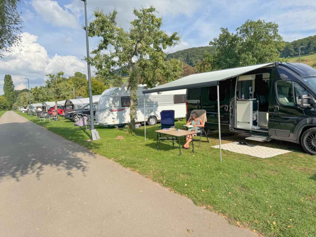 Camping in Winningen, grote camping op een eiland. Zelf een plek zoeken, geen afgebakende plaatsen. Je kunt er dag en nacht terecht. Na 19:00 op knopje je drukken om de slagboom open te maken, plaatsje zoeken en de volgde morgen aanmelden.
